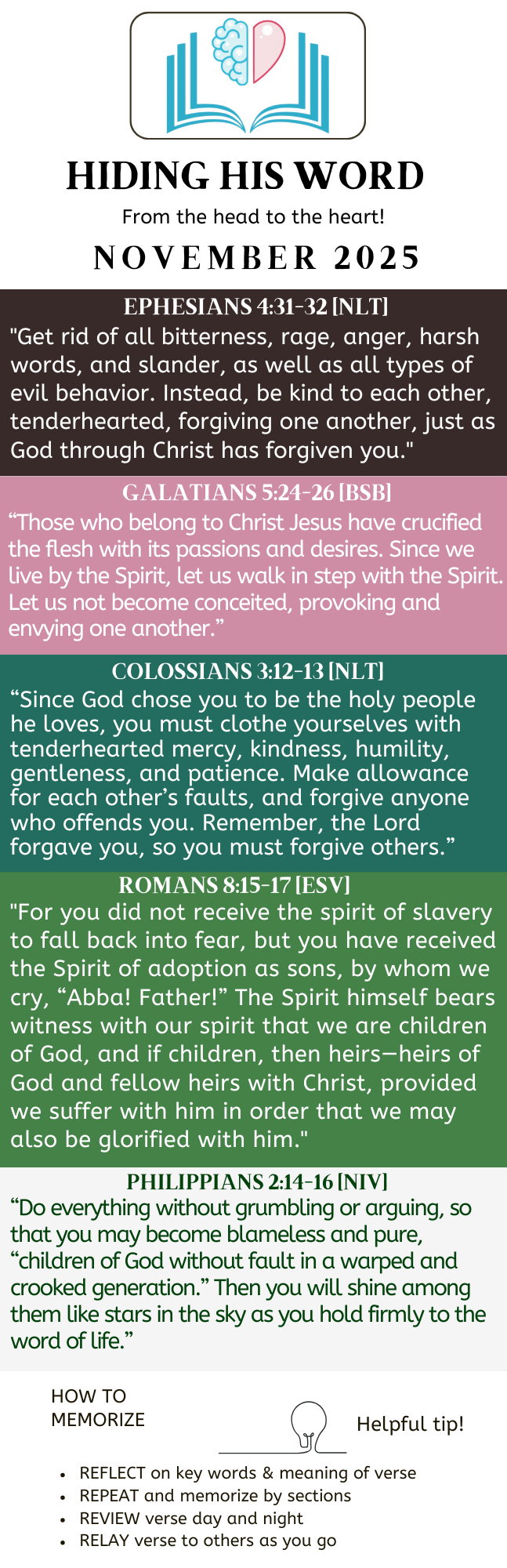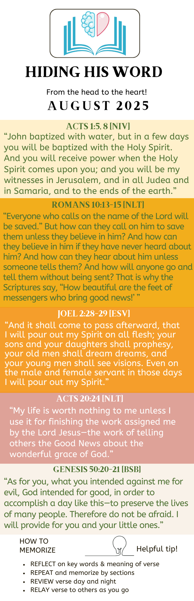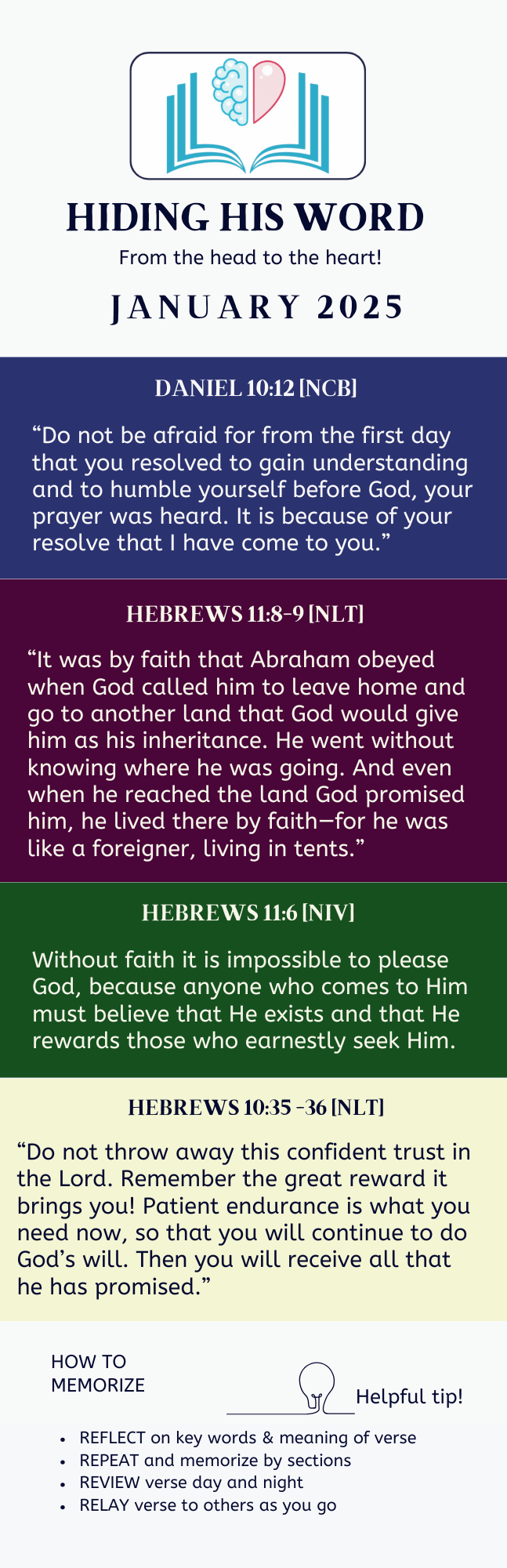 Every week we make time to memorize a verse of scripture related to the message being shared during our weekend services. This discipline is boosting the health of our minds, the power of our prayers, the authority of our lives. Check below for the compilation of this year's memory verses. Take the challenge and make it your goal to memorize all 52 verses this year.
